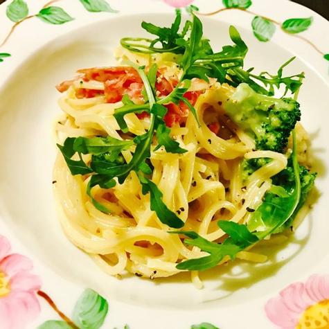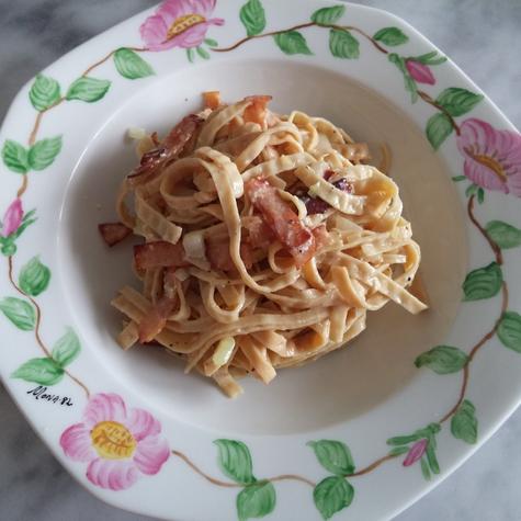 Hälsosam carbonara med bönpasta och kycklingbacon